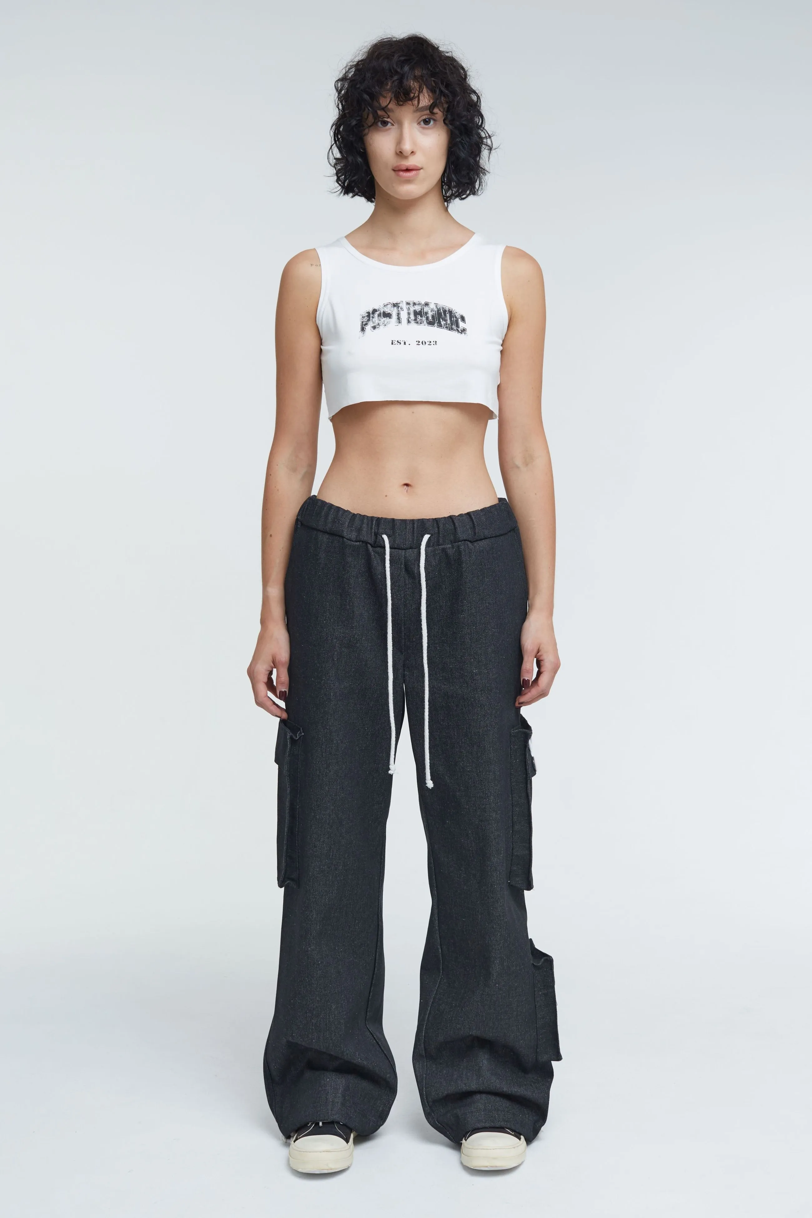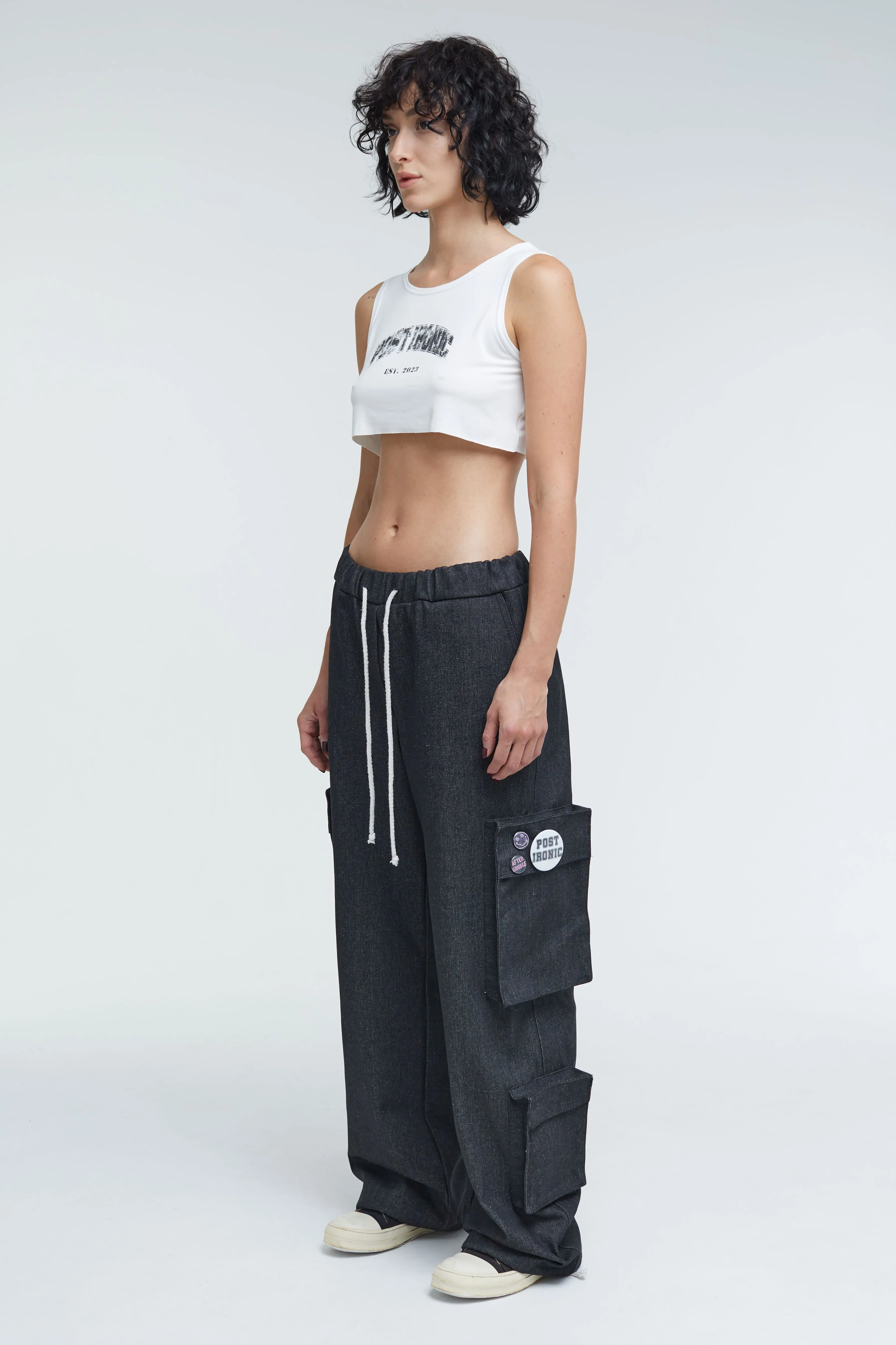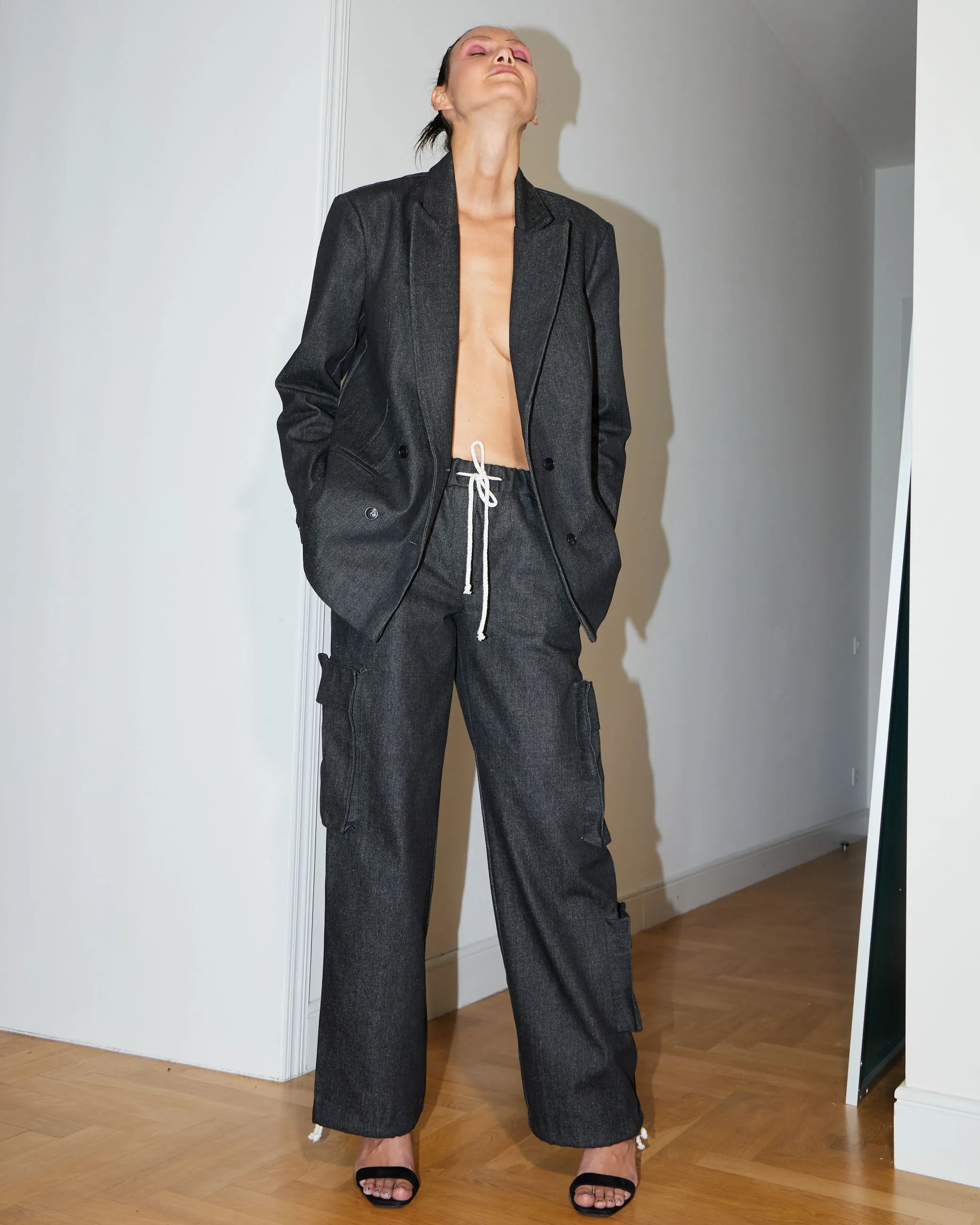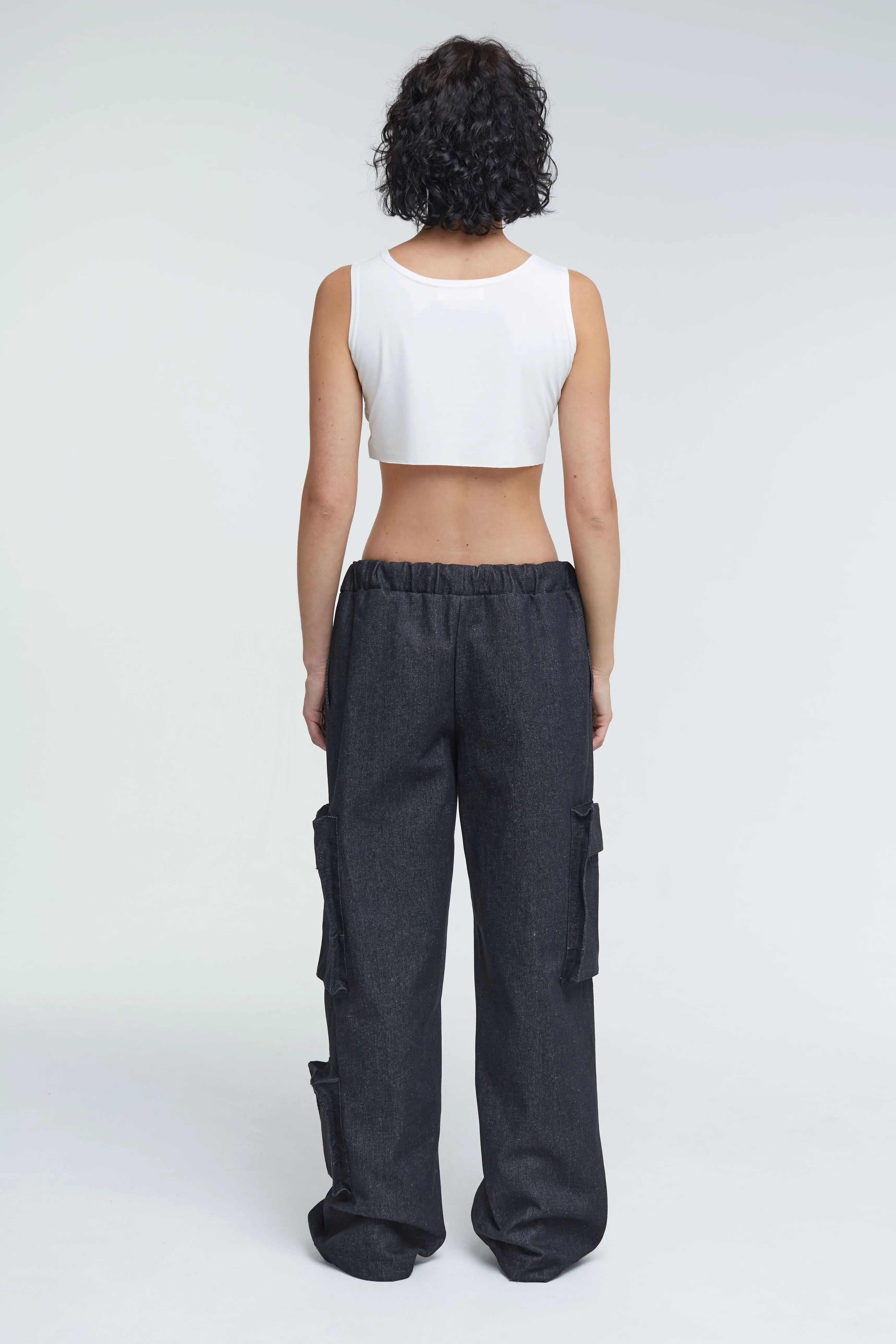 Черные брюки-карго. Модель свободного кроя выполнена из плотного прочного хлопка. Небрежный силуэт имитирует рабочую униформу.