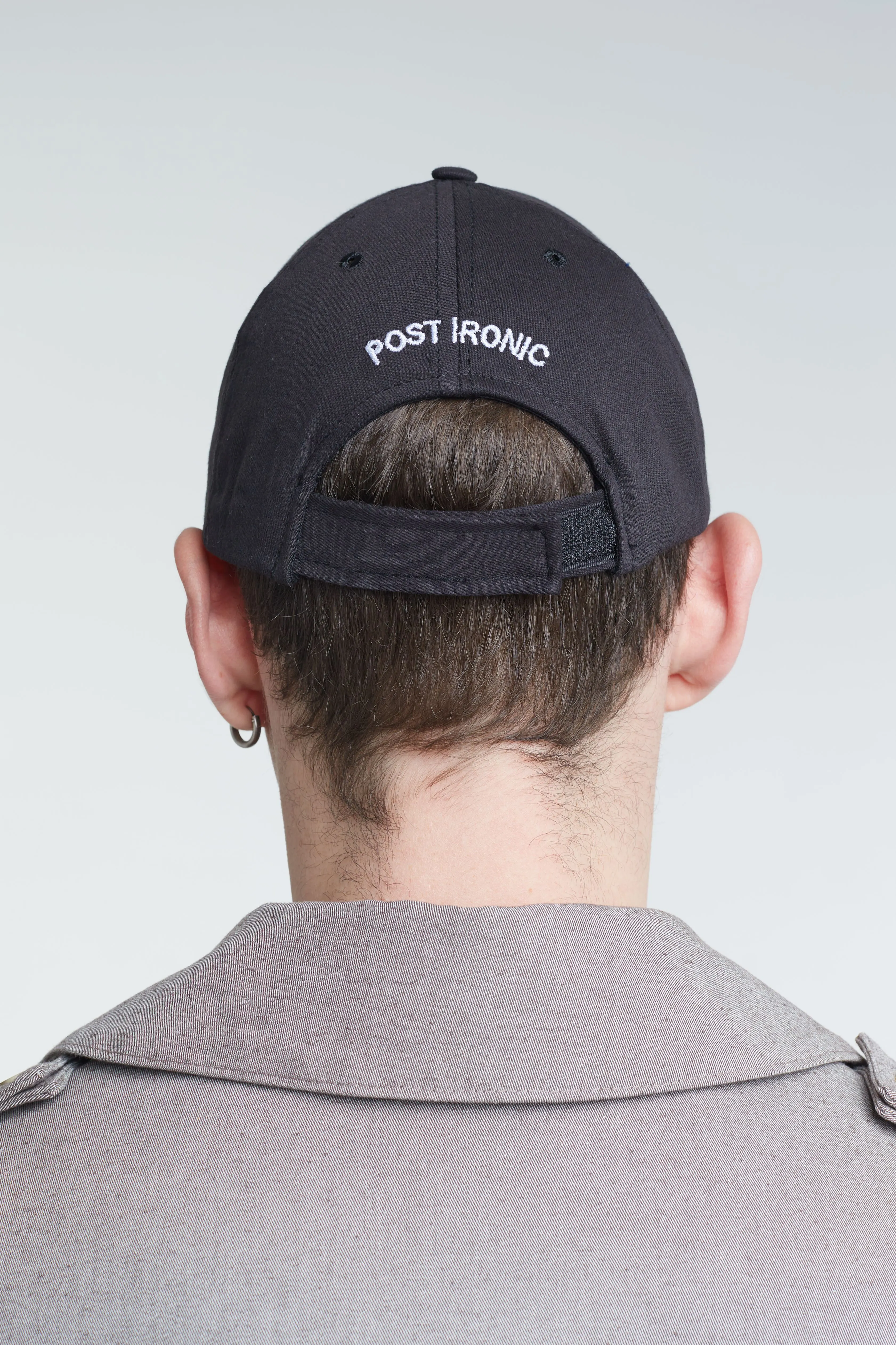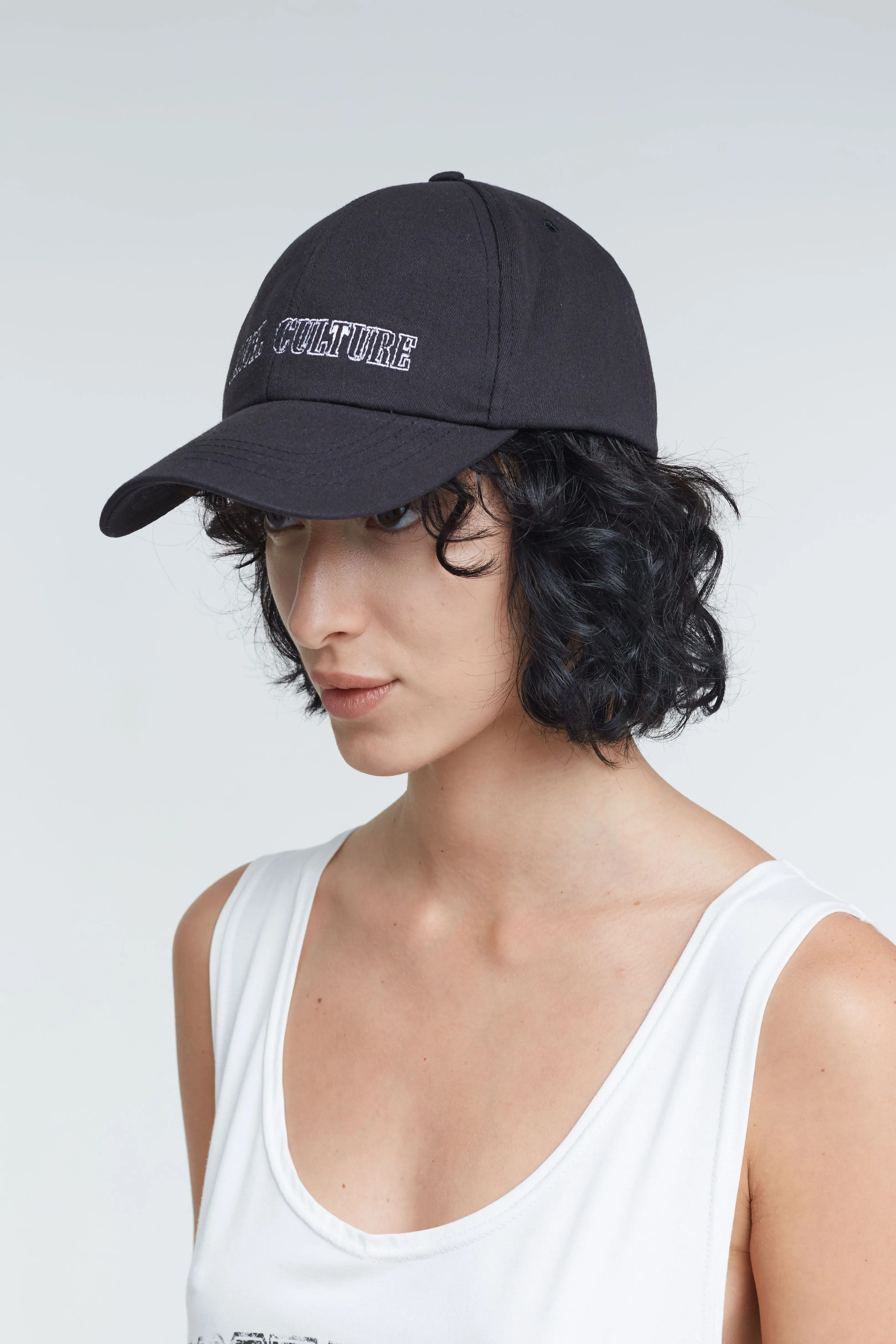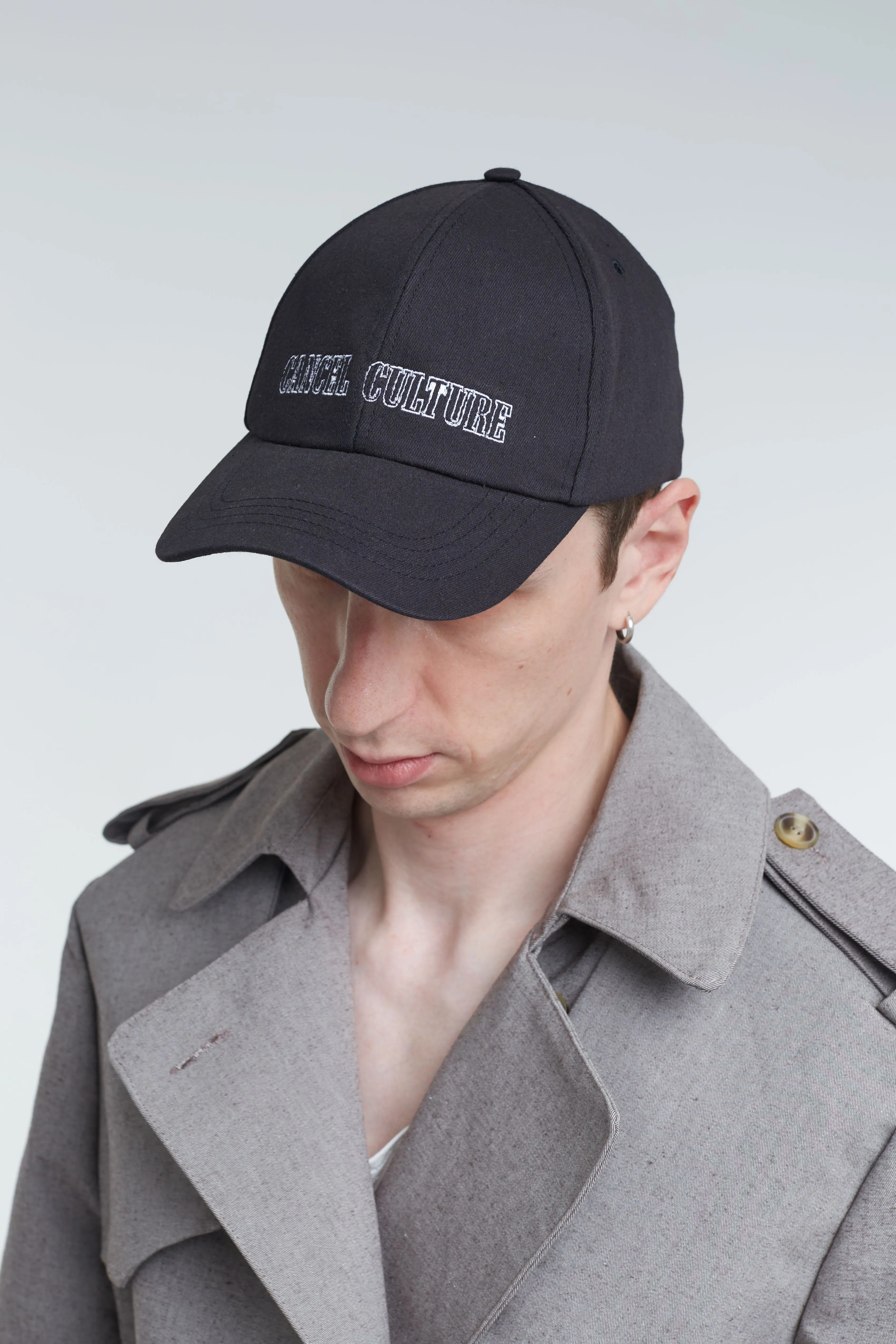 Бейсболка из черного прочного хлопка. Модель с широким стеганым козырьком дополнена двумя вышивками с логотипом бренда. Посадку аксессуара комфортно регулировать ремешком.