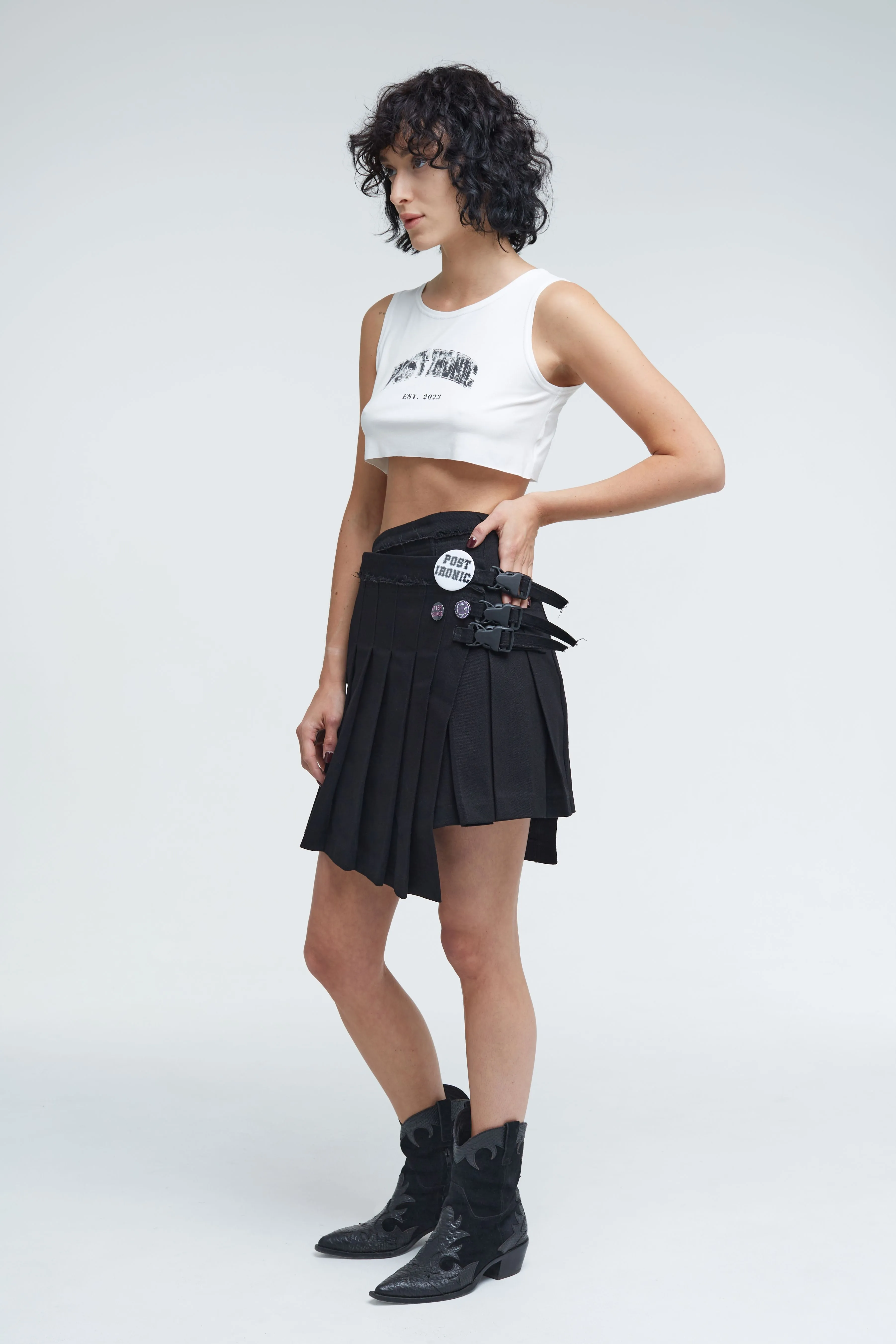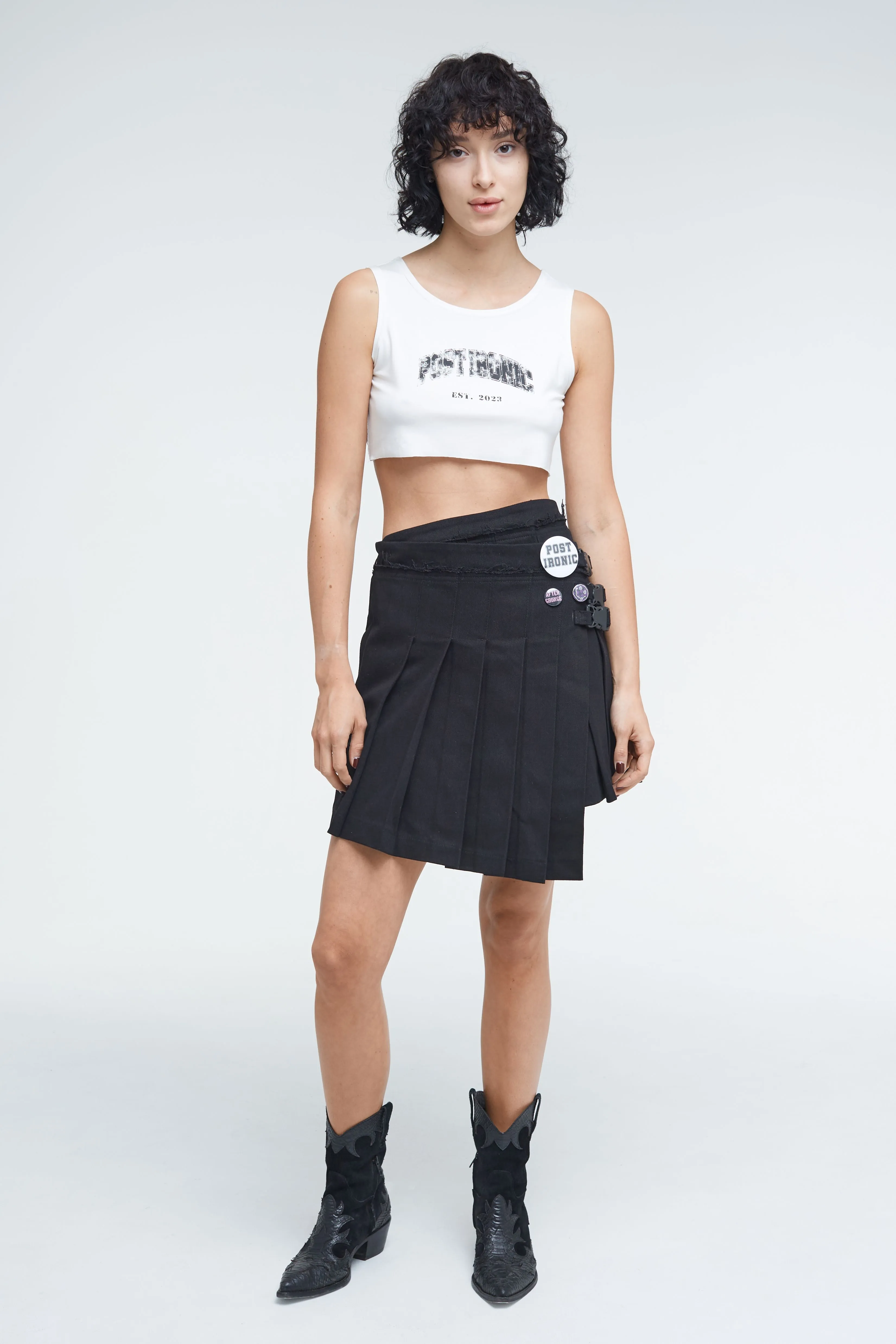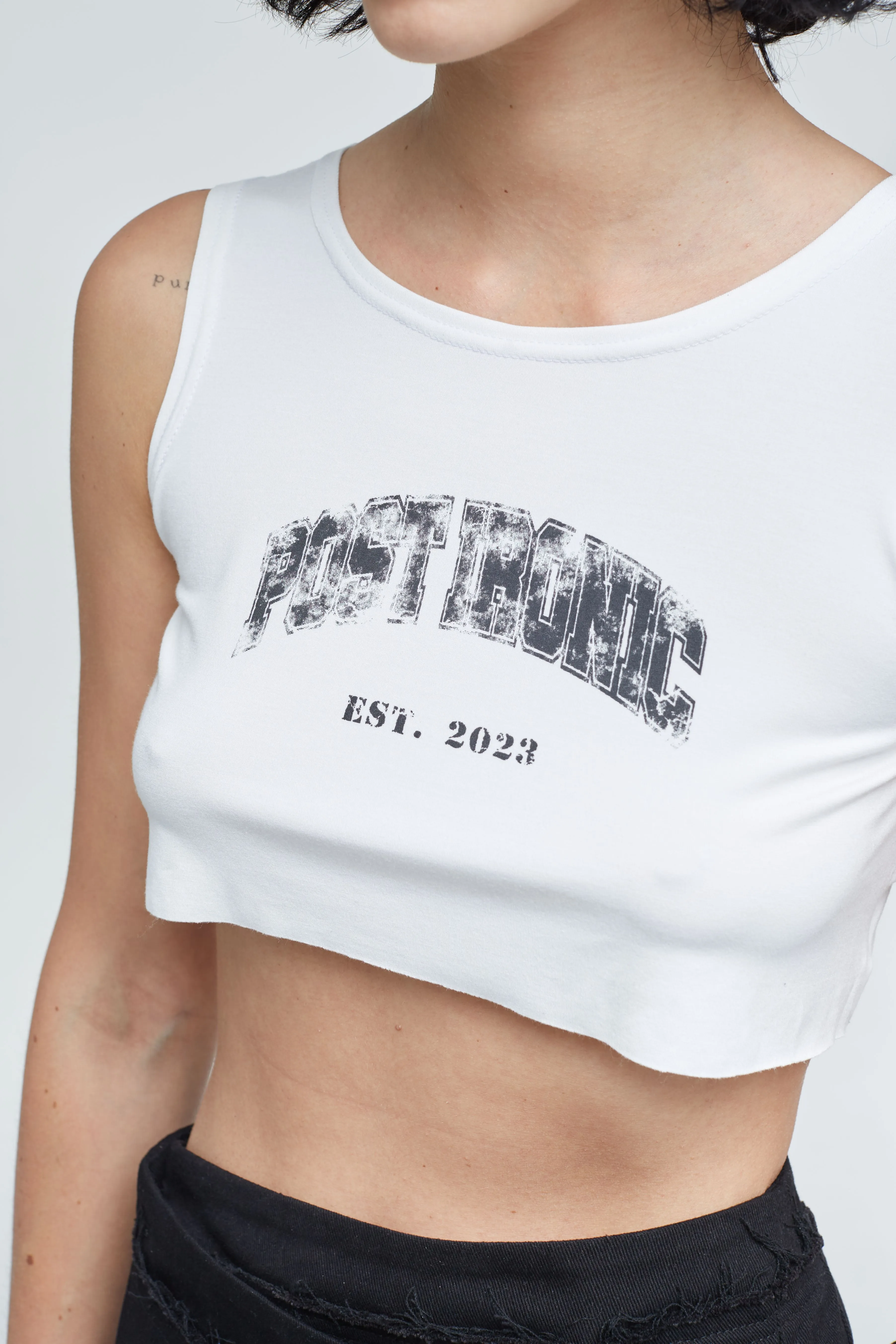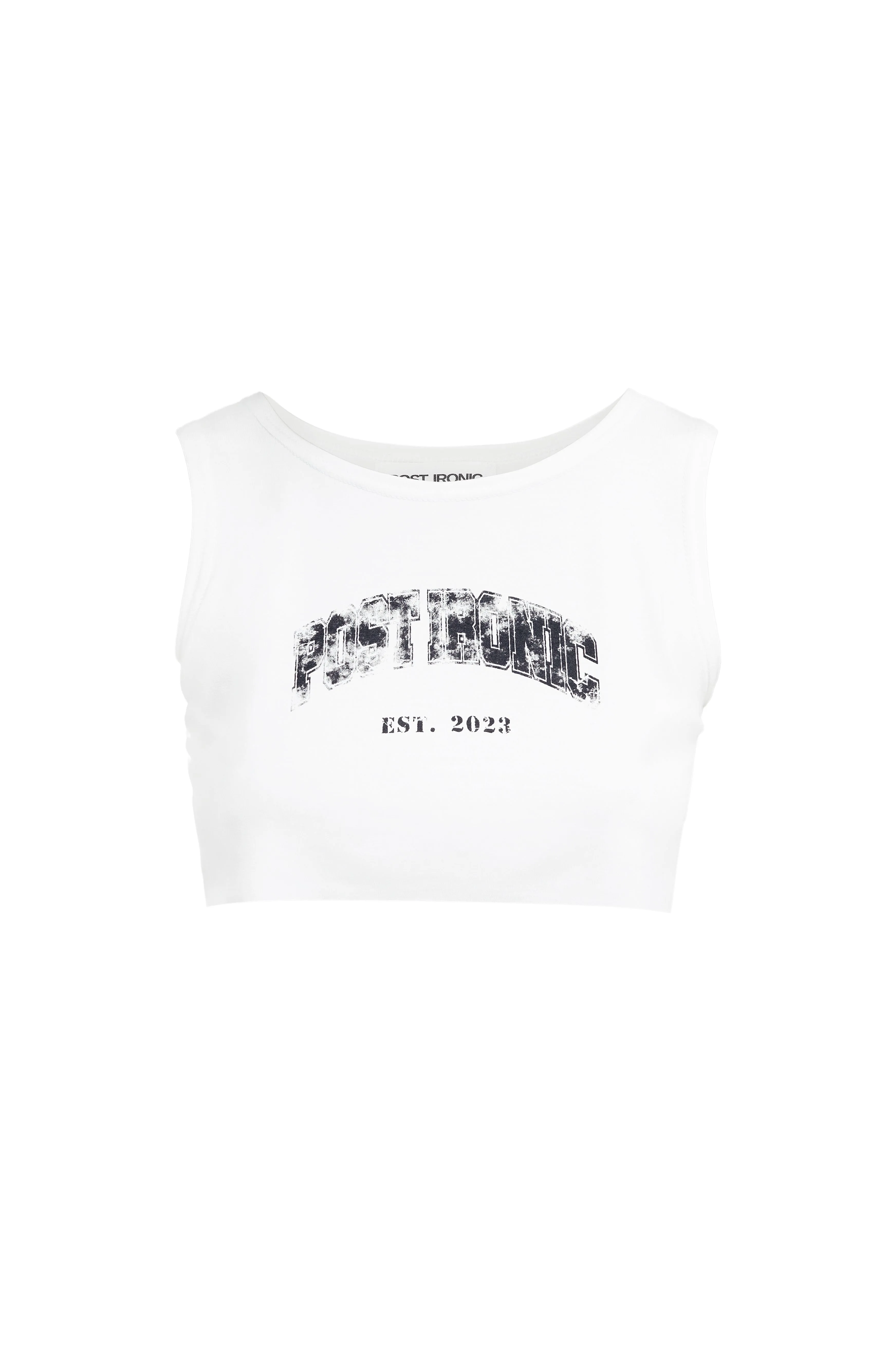 Кроп-топ из эластичного тончайшего хлопка. Нежный, приятный на ощупь материал облегает фигуру, но не сковывает движения. Изделие молочного цвета с принтом на груди в виде логотипа бренда.