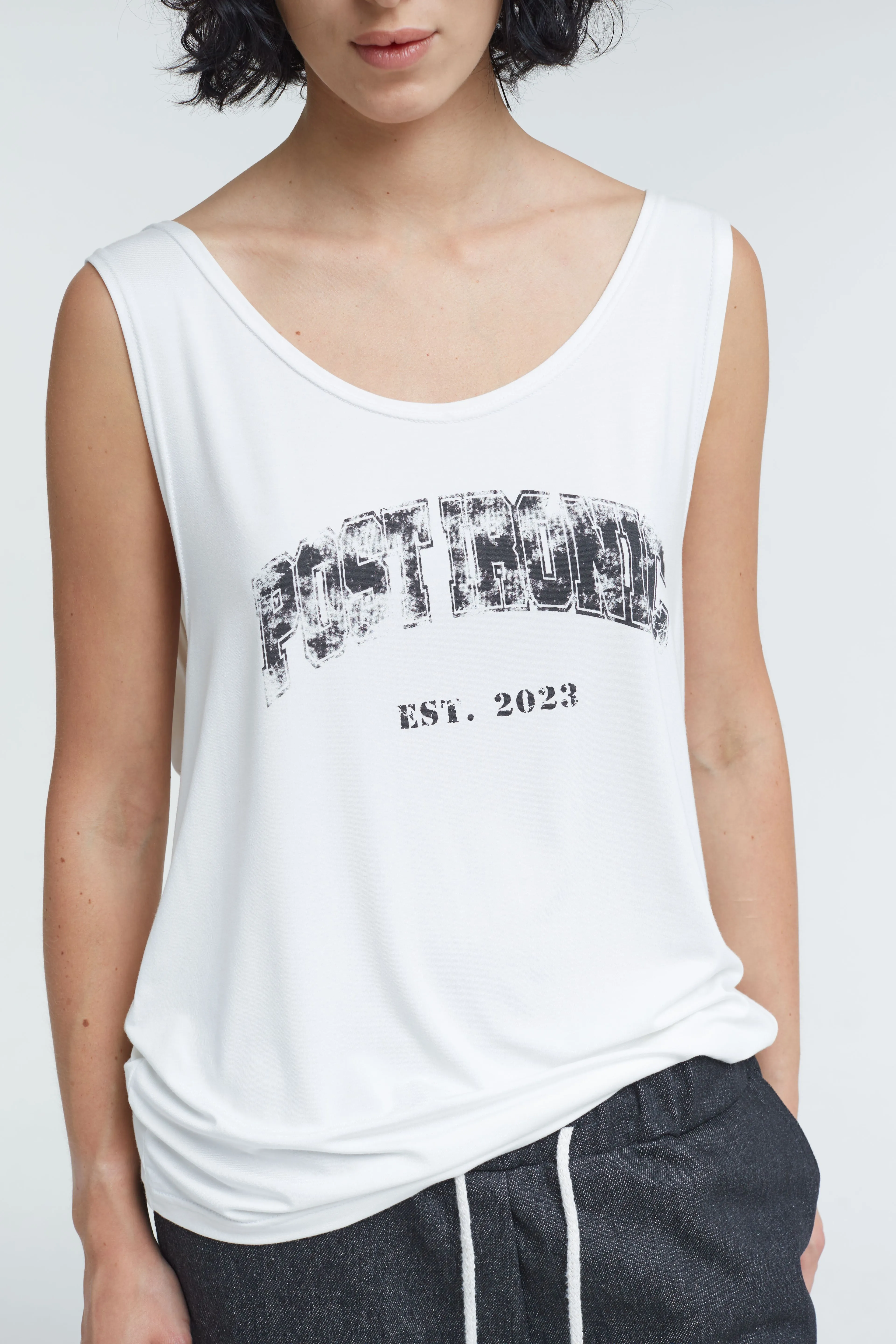 Майка из эластичного тонкого хлопка. Модель унисекс, свободного кроя, из мягкого материала молочного цвета. Крупный принт на груди в виде логотипа бренда.