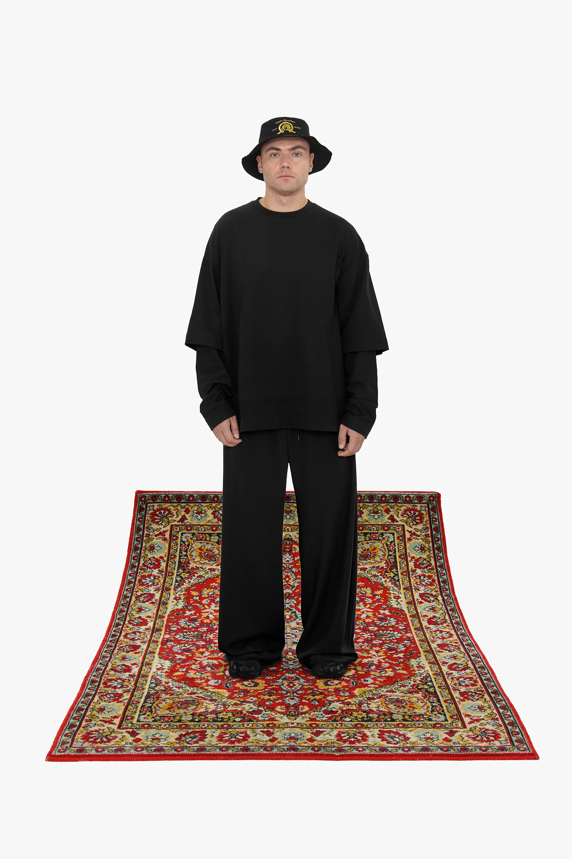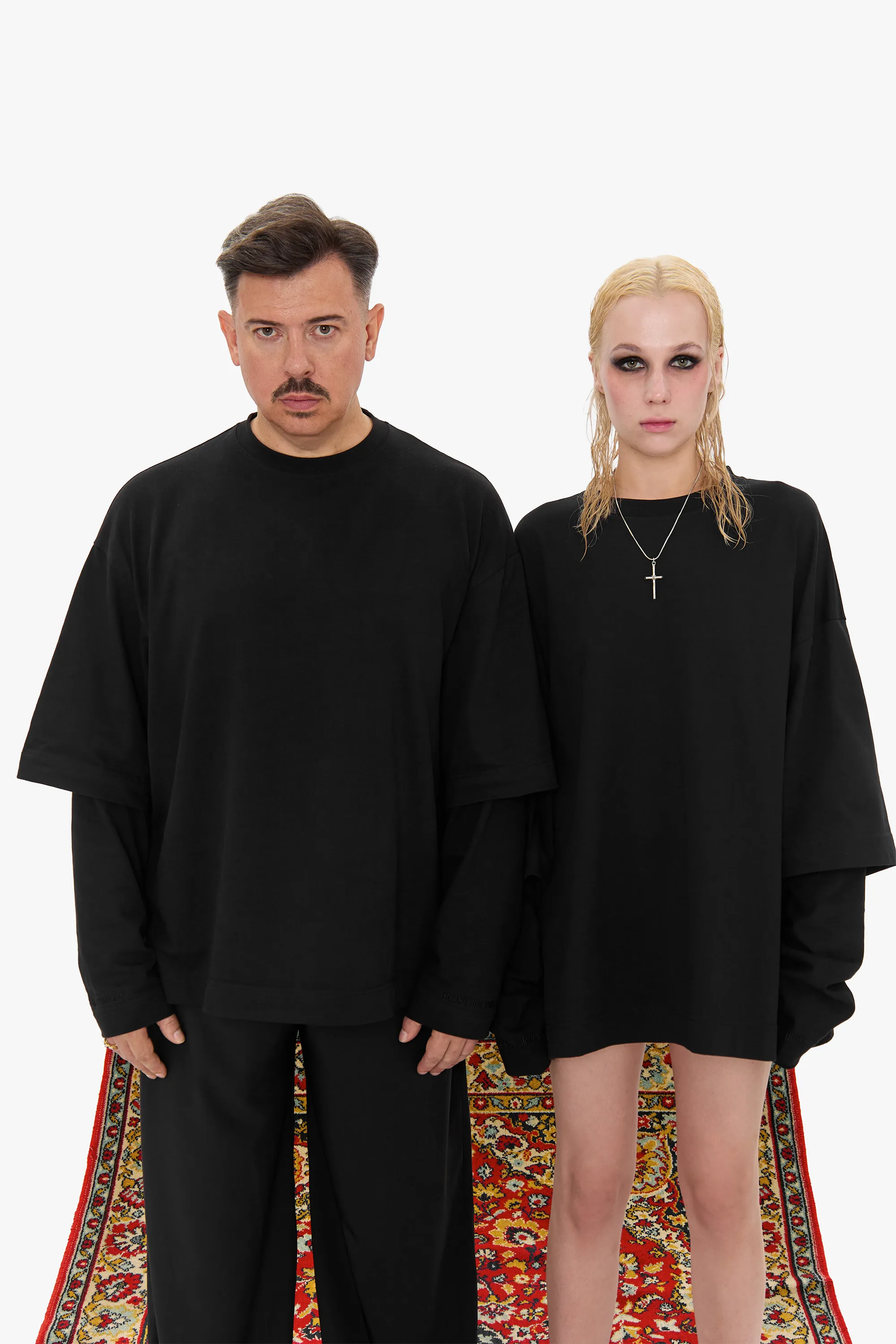 Свободная модель из плотного черного хлопка с крупным принтом на спине. Изделие выглядит как лонгслив, поверх которого надели футболку силуэта oversize. Длинные рукава декорированы вышивкой в тон изделию с логотипами двух брендов.